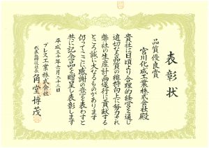 6月22日、プレス工業株式会社様から「品質優良賞」の表彰を頂きました。これを励みに全従業員が一丸となって、より一層の品質改善に努めて参ります。